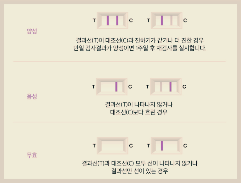 테스트기의 결과에 따라 아래와 같이 해석할 수 있습니다. 크게 양,음성 또는 무효로 결과 나오게 됩니다.