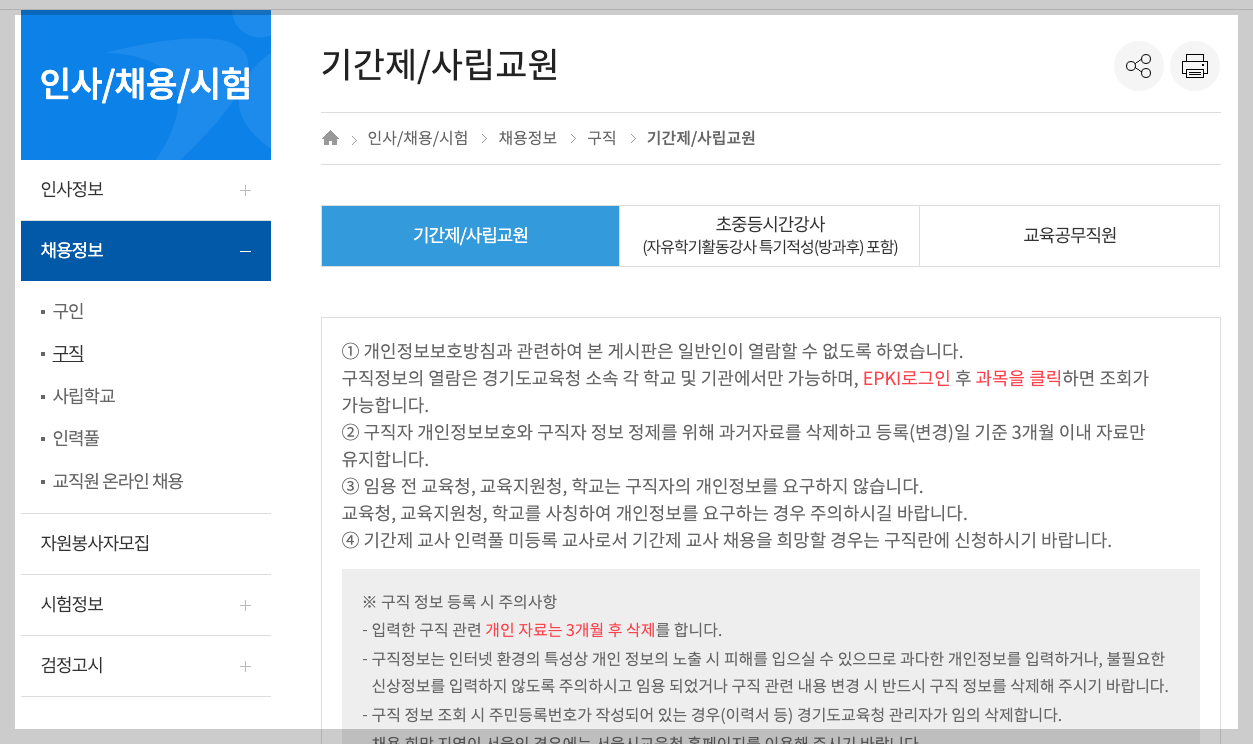 하지만 여기서 다른점은 일반인이 열람할 수 없도록 되어있다는 점입니다. 구직정보의 열람은 경기도교육청 소속 각 학교 및 기관에서만 가능하며, EPKI로그인 후 과목을 클릭하면 조회가 가능합니다. 더불어 구직자 개인정보보호를 위해 3개월 이내 자료만 유지되는 것이 또 하나의 특징이라고 할 수 있습니다.
