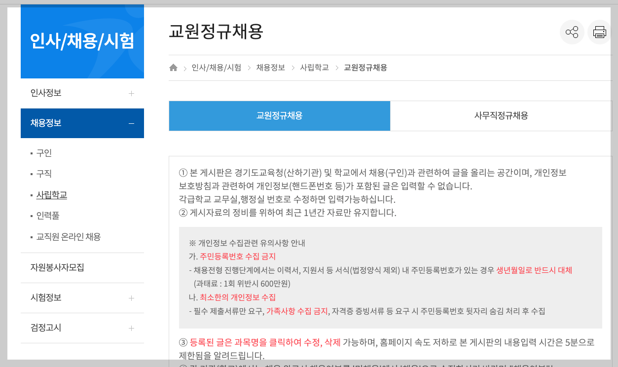 다음으로는 사립학교 메뉴를 살펴보도록 하겠습니다. 이전 메뉴들과 달리 교원정규채용 및 사무직 정규채용 두 가지 소 메뉴로만 구성되어져 있습니다. 상세메뉴는 위의 메뉴들과 거의 같기에 추가적인 설명은 넘어가도록 하겠습니다.