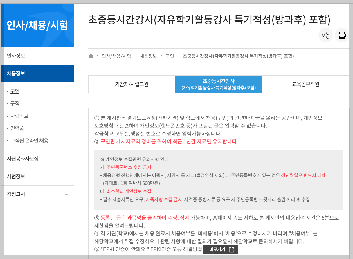 초중등시간강사 (자유학기활동강사 특기적성(방과후) 포함) 메뉴를 눌러보니 마찬가지로 주의사항이 먼저 나오는 것을 확인하실 수 있을겁니다. 여기서 눈으로 쓱 읽으신 후 스크롤을 내리면 본격적인 정보를 볼 수 있게 됩니다. 이것도 빠르게 한 번 살펴보도록 하겠습니다.