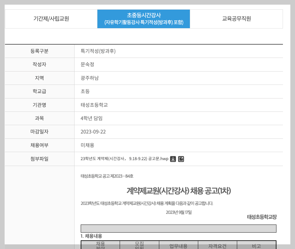 위의 다양한 메뉴에서 저는 시흥 금모레초 시간강사(5년) 정보를 눌러보았습니다. 시간 강사를 급하게 구하고 있다는 메시지와 함께 9월 21일까지의 기간과 담당연락처를 기재한 화면을 보실 수 있게 되실겁닌다. 마찬가지로 다른 메뉴들도 비슷하게 구성되어 있다고 생각하시면 될 것 같습니다. 자 그럼 2번째 메뉴 초중등시간강사 메뉴를 한 번 눌러보도록 하겠습니다.