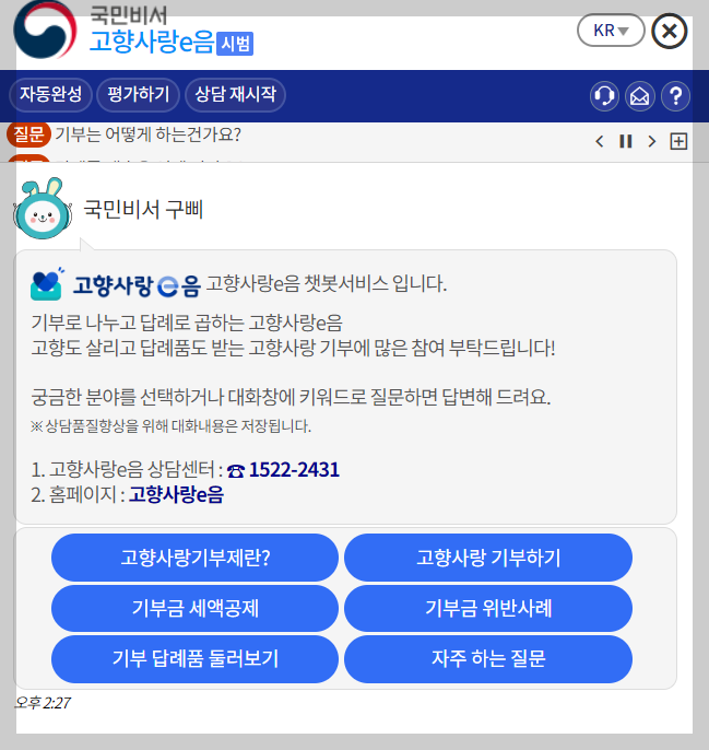 더불어 고향사랑기부제에 추가로 궁금하신 사항이 있으신 경우 홈페이지에서 상담을 도와주는 챗봇이 있으며 상담센터 1522-2431번으로 문의가 가능하니 이점 또한 참고하여 주시기 바랍니다.