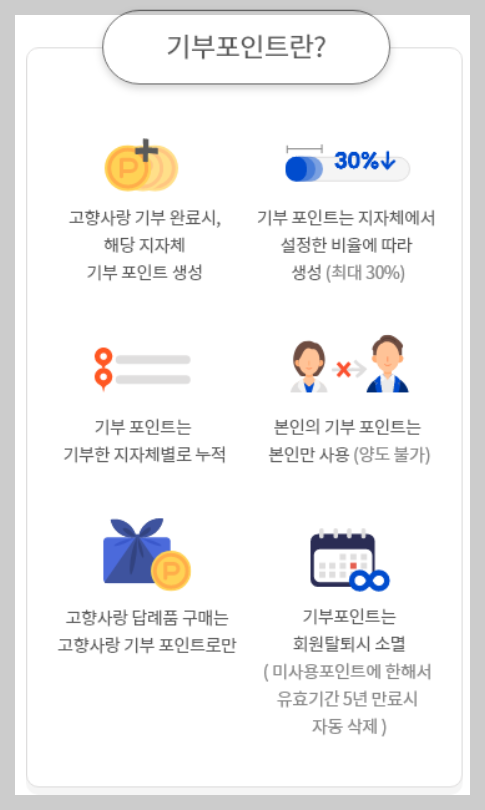기부 금액의 30%가 포인트로 제공됩니다. 이를 활용하여 답례품과 상품권에 사용이 가능합니다. 예를 들어 10만원 기부시 3만원의 혜택을 제공 받을 수 있으며 이를 통해 답례품 등을 구입할 수 있습니다.