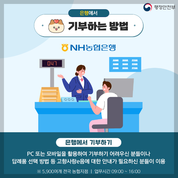 오프라인으로 진행할 시에는 은행에서 진행이 가능합니다. NH농협은행을 이용하시면 되며 PC, 모바일 기부가 힘드신 분들은 이를 이용하시면 됩니다.