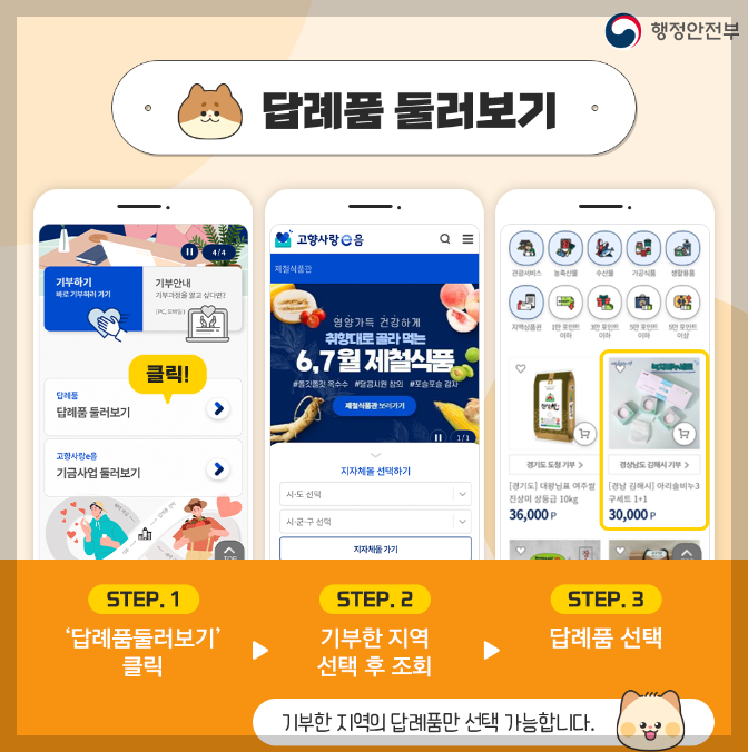 고향사랑이음 홈페이지 답례품 확인 하기