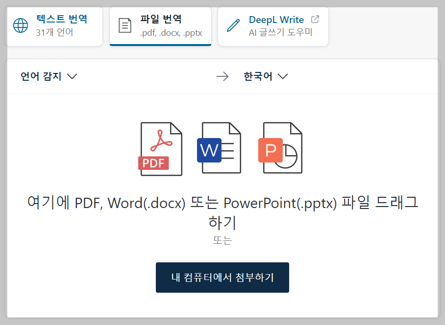 딥엘은 여러가지 추가 기능이 있습니다. 아래에 보시는 것처럼 PDF, 워드, 파워포인트 파일을 드래그해서 첨부하면 이 또한 번역이 가능합니다.