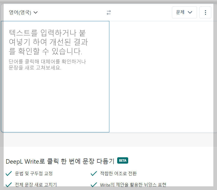 또한 DeepL Write로 문장 또한 다듬을 수 있습니다. 문법 및 구두점 교정이 가능하며, 적합한 어조로 전환을 시켜주며, 전체 문장 새로 고치기, 뉘앙스 표현 등을 클릭 한 번에 문장을 다듬어 주는 기능이 있습니다.