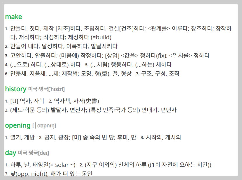 더불어 하단으로 스크롤을 더 내려보면 핵심 단어에 대해 자세한 한국어 뜻을 보실 수 있게 됩니다. 해당 단어들을 익혀 놓으면 다음에는 번역기 없이도 한국어 뜻을 알게 될 것이라 생각합니다.