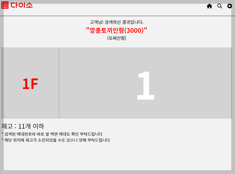하나 유의하실 점은 바로 다이소 직영 매장만 검색할 수 있다고 합니다. 즉 다시말해 대형마트에 입점한 다이소의 경우 직영이 아니기 때문에 재고 확인이 불가합니다. 더불어 실시간 정보는 아닐 수 있습니다. 위의 재고 11개 이하 밑에 보시면 아시다 시피 해당 위치에 재고가 소진되었을 수 도 있으니 양해 부탁드립니다라는 안내 멘트를 보실 수 있을 것입니다. 이를 통해 추론해 본 바 실시간 정보는 아닐 수 있다라는 결론을 도출해 냈습니다. 사이트 오픈이 얼마 되지 않았기 때문에 아직도 손 볼 곳들이 많아 보입니다.