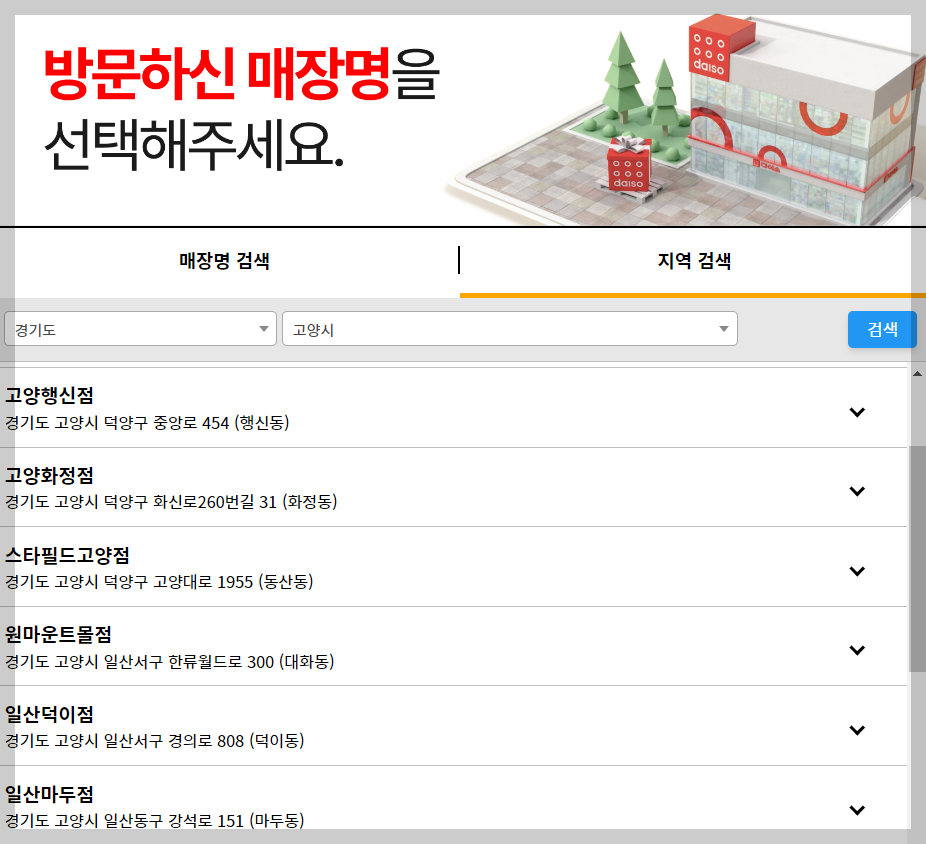 사이트에 들어오게 되면 아래와 같은 홈페이지를 보실 수 있게 됩니다. 아무런 추가 메뉴 없이 매장명 검색과 지역검색 두 가자 메뉴가 있는 것을 볼 수 있게 됩니다.  방문을 원하시는 매장명을 검색하셔도 되며 모를 경우에는 지역으로 검색하시기 바랍니다. 저는 고양시를 검색해 보도록 하겠습니다.
