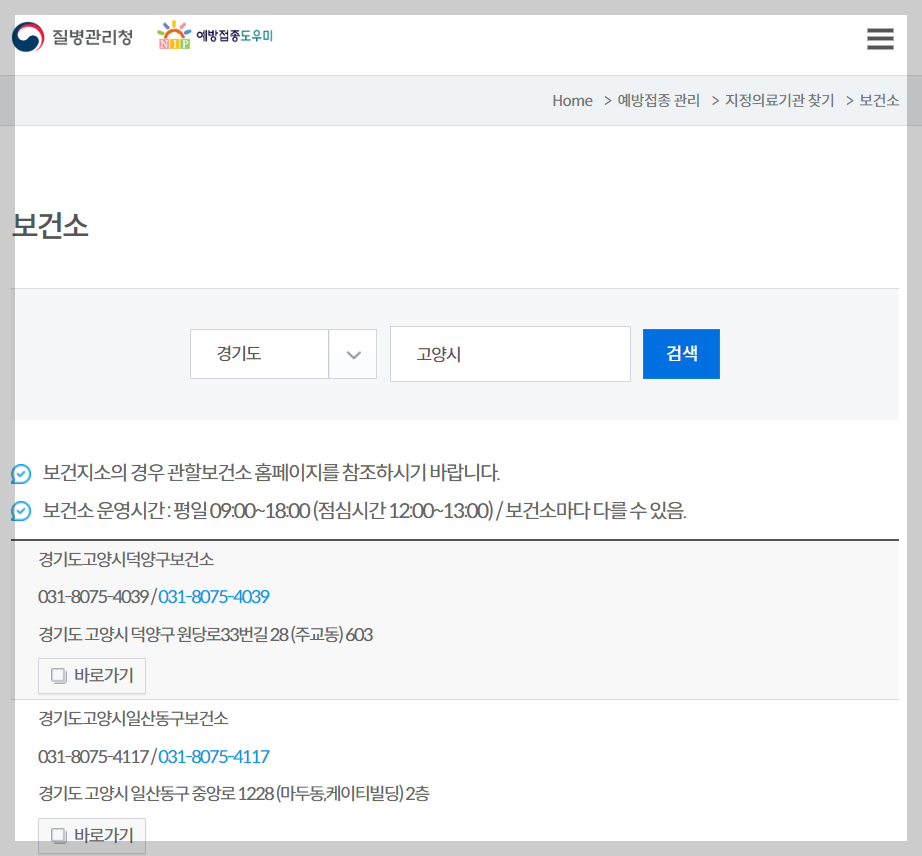 저는 고양시를 검색해 보았습니다. 검색하니 전화번호에서 주소, 해당 보건소로 바로 갈 수 있도록 화면이 구성되어져 있었습니다. 이제 보건소를 찾았으니 바로 검사를 받으러 가 보겠습니다.