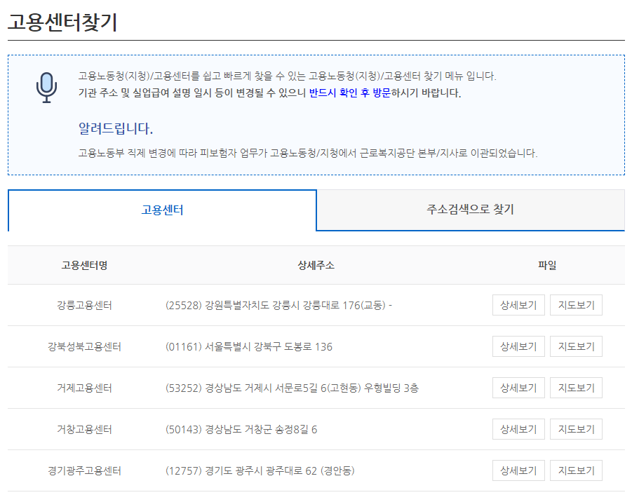 더불어 말씀드리고 싶은 것은 온라인에서 정보를 찾는 것도 어느 정도 도움은 되지만 개인의 현 상황이 모두 다르므로 100% 본인 상황에 들어 맞는 정보는 찾기 힘들 수 있습니다. 따라서 고용센터에 전화 문의나 직접 방문하여 상담 받는 것이 가장 정확하므로 아래 고용센터 찾기 메뉴를 통해 집 근처 고용센터를 찾아 보신 후 방문하시는 것을 추천 드립니다.