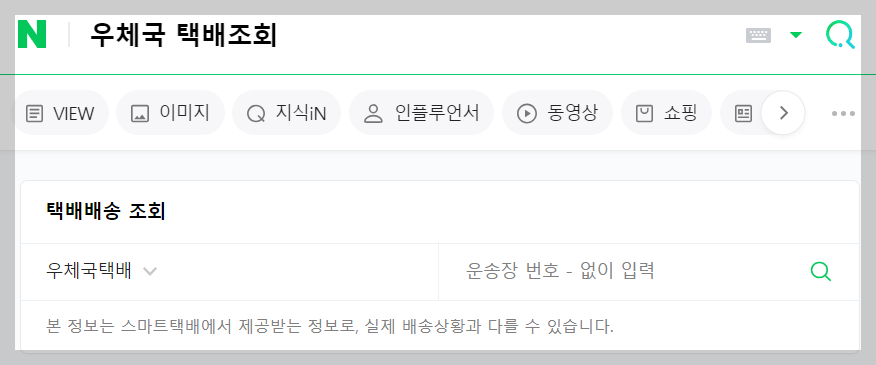 다음으로는 각종 포털에서 택배 조회하는 방법도 안내드리도록 하겠습니다. 첫 번째로 네이버입니다. 네이버 검색창에 우체국 택배조회를 클릭하시거나 제가 안내드리는 버튼을 활용하여 해당 화면으로 들어오시면 됩니다. 그러면 아래와 같은 화면을 보실 수 있게 되실겁니다.