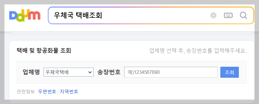 두 번째로 다음 플랫폼에서 확인하는 방법입니다. 위의 방법과 동일합니다. 다음 검색창에서 우체국 택배조회를 검색하시거나 제가 준비해 놓은 버트을 활용하시면 됩니다.
