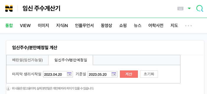 A: 네이버에서 "임신주수 계산기" 혹은 "출산예정일"을 검색하면 쉽게 나와! 당신의 마지막 생리 시작일만 입력하면 네이버가 자동으로 계산해 줄 거야!