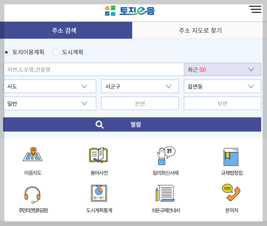 다음으로 토지이음에서 지적도 열람하는 방법입니다. 토지이음은 또 다른 인기 있는 지적도 열람 사이트입니다. 여기서도 주소지를 입력하여 지적도를 열람할 수 있으며, 화면을 캡처하는 것은 가능하지만 정식 발급된 문서 형태로 출력하는 것은 불가능합니다. 즉 다시말해 조회만 가능한 사이트이며 업무에 필요한 문서형태가 필요할 경우 위에서 안내드린 정부 24 사이트를 이용하시기 바랍니다.