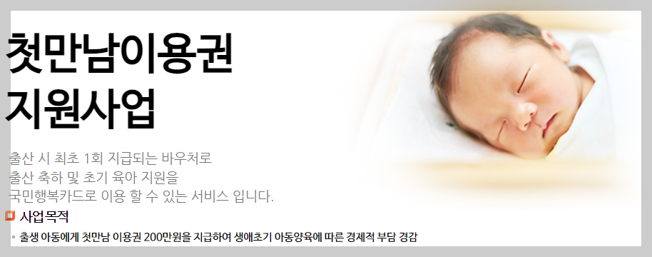 첫만남 이용권은 첫아이를 출산한 모든 가정을 대상으로 1명당 200만 원의 지원금을 제공합니다. 특히 쌍둥이나 삼둥이와 같은 다둥이 가정의 경우, 아동 1명당 200만 원씩 추가 지원됩니다. 이 지원금은 국민행복카드 포인트로 지급되기 때문에, 국민행복카드를 보유하고 있어야 합니다.