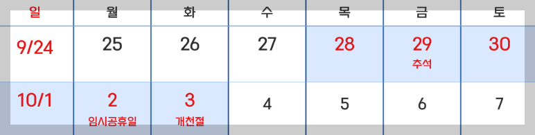 결론부터 말씀드리자면 10월 2일 월요일은 임시공휴일로 지정되었습니다. 즉 9월 28일부터 10월 3일까지 즐거운 황금연휴가 되었습니다.