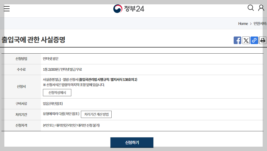 가장 먼저 정부 24 홈페이지에 접속 후 로그인을 합니다. 그런 후 민원서비스 메뉴를 누른 후 출입국에 관한 사실증명 페이지로 이동하면 됩니다. 편의를 위해 제가 바로 갈 수 있는 버튼을 아래에 마련해 놓았으니 해당 내용 참고하시기 바랍니다.