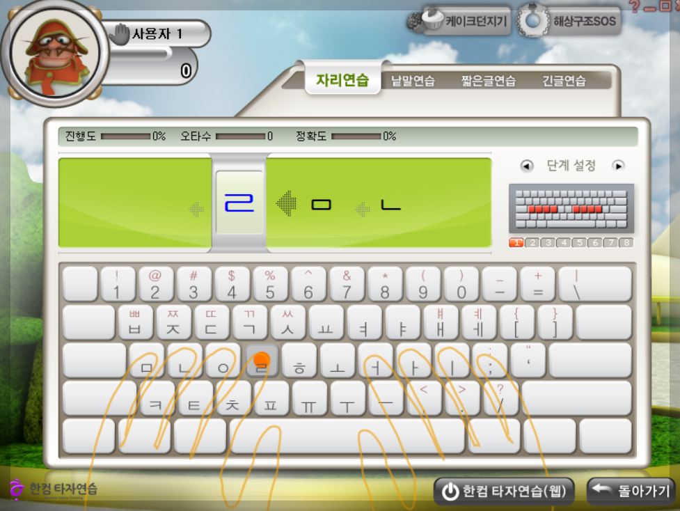 가장 쉬운 버전인 자리연습부터 익히시고 난 후에 낱말연습으로 넘어가고 짧은글연습, 마지막으로 긴글까지 연습하면 어느정도 한글 키보드에 익숙해질 것이라 생각합니다.