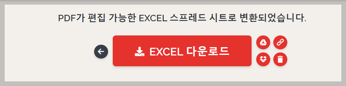 위의 2가지 중 OCR없음 버튼을 누른 후 가장 하단의 EXCEL로 변환 버튼을 누르면 작업은 마무리 됩니다. 작업이 완료되면 아래와 같은 완료화면을 보실 수 있게 되실겁니다.