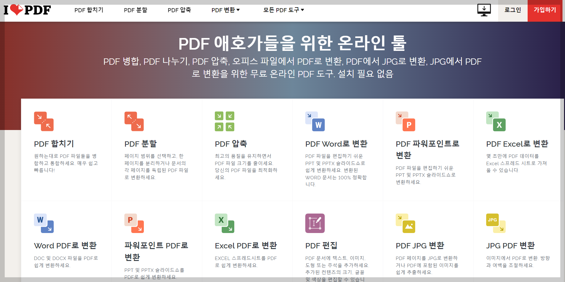 아이러브PDF에서는 PDF로 할 수 있는 작업을 모두 할 수 있는 효율성 높은 사이트입니다. PDF 합치기, 분할, WORD 변환, 압축, PPT 변환, JPG 변환, 편집 등 우리가 필요로하고 생각할 수 있는 모든 작업들을 진행할 수 있습니다.