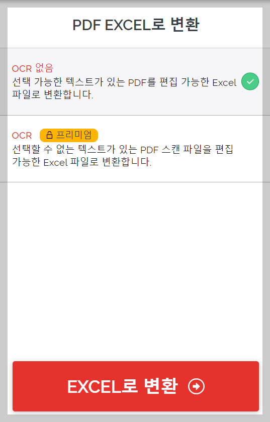 위의 2가지 중 OCR없음 버튼을 누른 후 가장 하단의 EXCEL로 변환 버튼을 누르면 작업은 마무리 됩니다. 작업이 완료되면 아래와 같은 완료화면을 보실 수 있게 되실겁니다.
